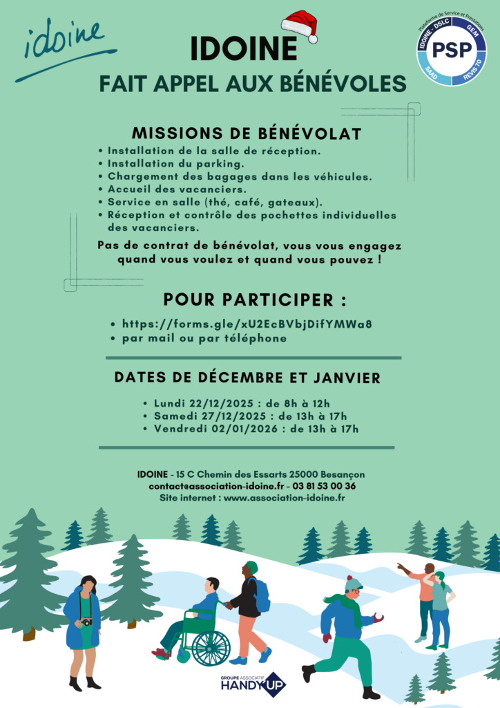 VOUS ÊTES DISPONIBLE ? Vous pouvez vous inscrire via ce lien : https://forms.gle/xU2EcBVbjDifYMWa8 (réponse visible uniquement par Idoine), nous contacter au 03-81-53-00-36 ou par mail à contact@association-idoine.fr.