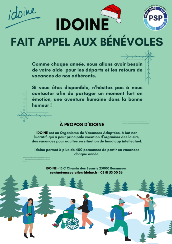 VOUS ÊTES DISPONIBLE ? Vous pouvez vous inscrire via ce lien : https://forms.gle/xU2EcBVbjDifYMWa8 (réponse visible uniquement par Idoine), nous contacter au 03-81-53-00-36 ou par mail à contact@association-idoine.fr.